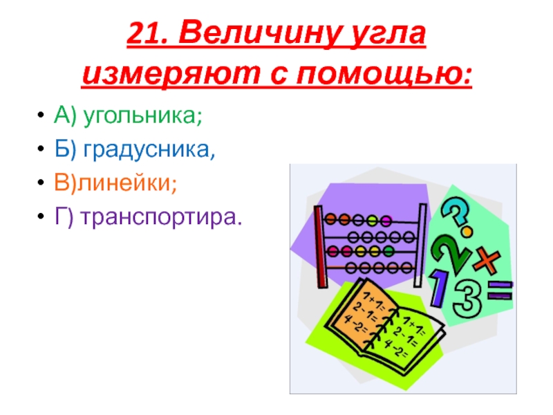 21. Величину угла измеряют с помощью:А) угольника;Б) градусника,В)линейки;Г) транспортира.