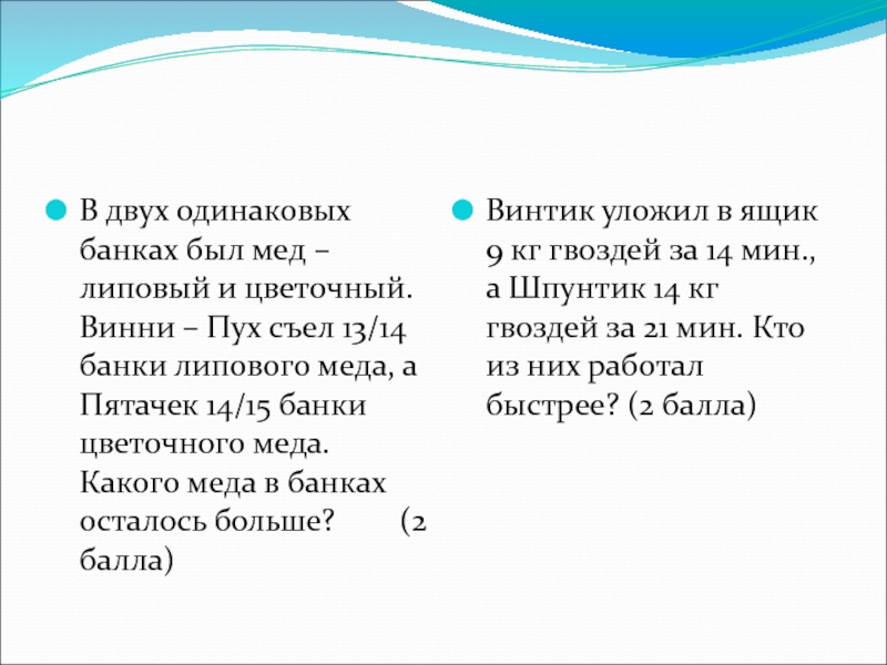 Винтик уложил в ящик 9 кг гвоздей за 14 мин., а Шпунтик 14 кг гвоздей за 21 мин. Кто из них работал быстрее? (2 балла)