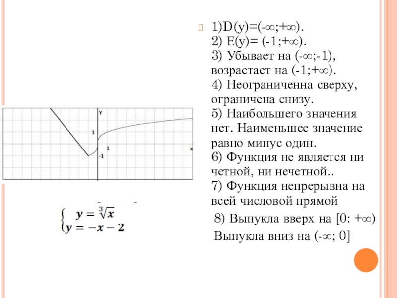 Слайд 141)D(y)=(-∞;+∞). 2) Е(у)= (-1;+∞). 3) Убывает на (-∞;-1), возрастает на (-1;+∞). 4) Неограниченна