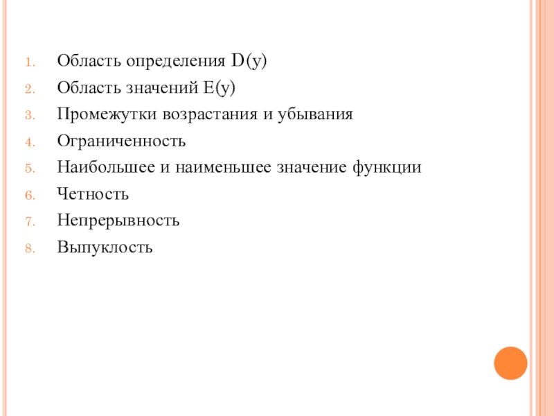 Область определения D(y)Область значений Е(у)Промежутки возрастания и убыванияОграниченностьНаибольшее и наименьшее значение функцииЧетностьНепрерывностьВыпуклость