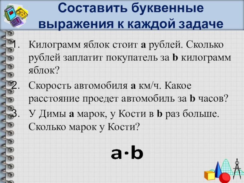 Слайд 3Составить буквенные выражения к каждой задаче