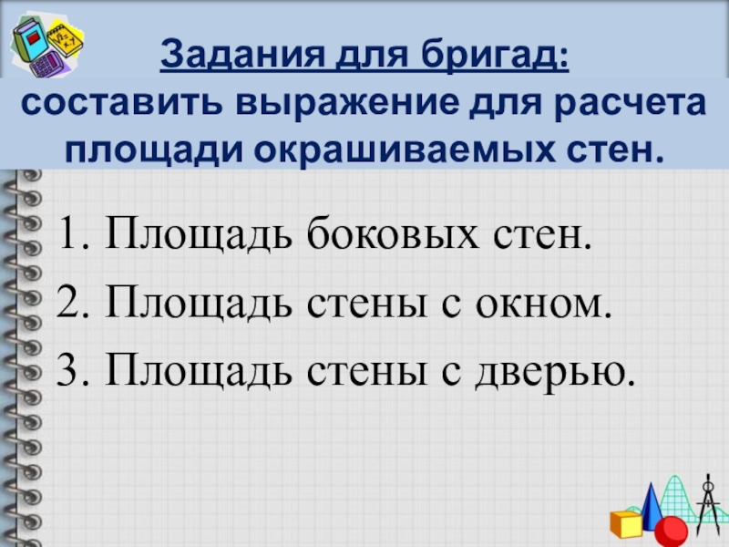 Слайд 8Задания для бригад: составить выражение для расчета площади окрашиваемых стен.