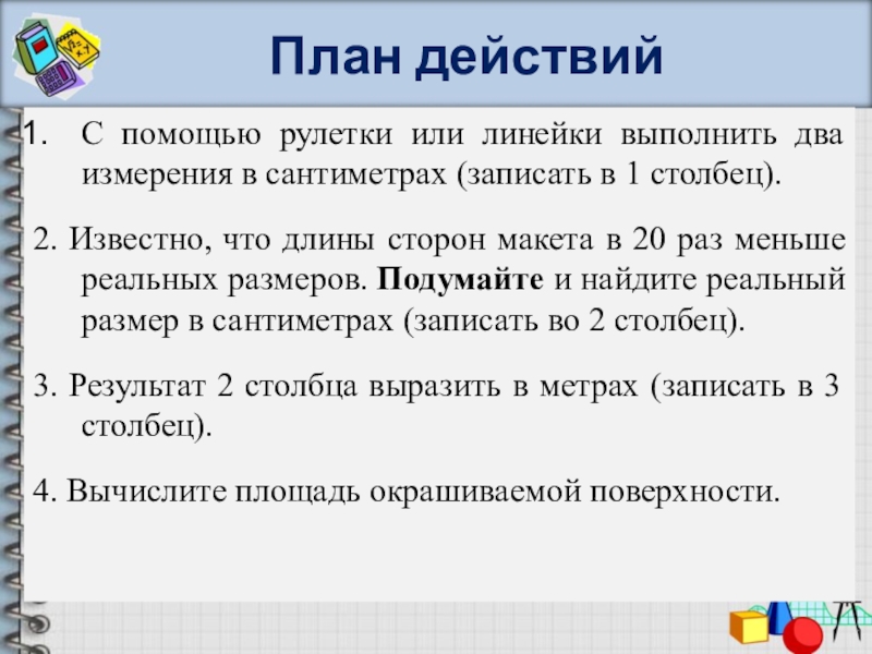 План действийС помощью рулетки или линейки выполнить два измерения в сантиметрах (записать в 1 столбец).2. Известно, что