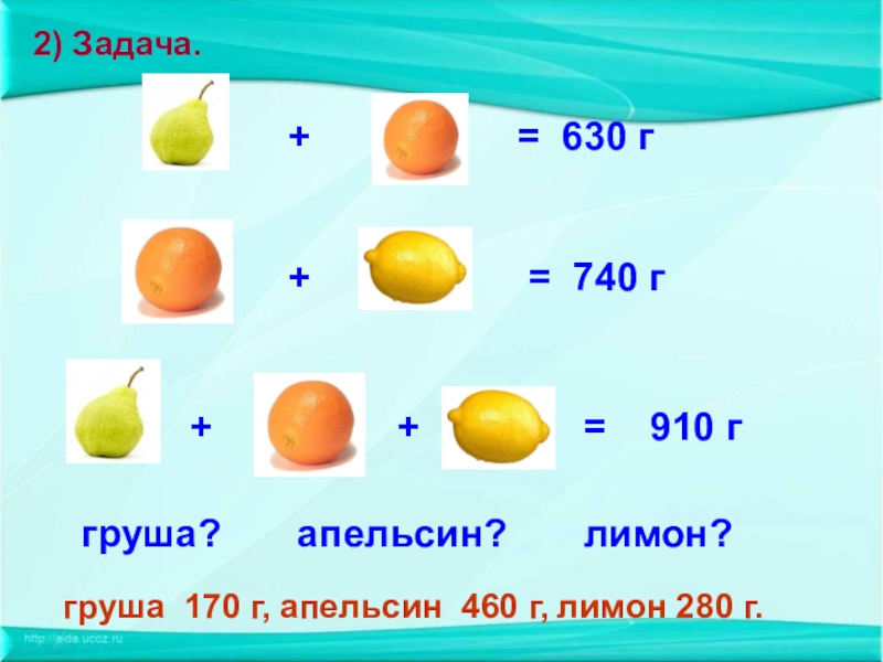 груша 170 г, апельсин 460 г, лимон 280 г.