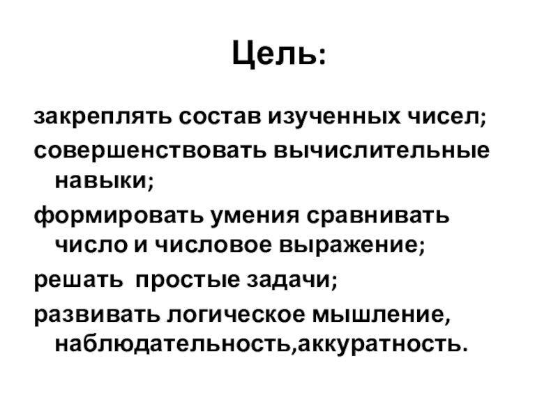 Цель:закреплять состав изученных чисел;совершенствовать вычислительные навыки;формировать умения сравнивать число и числовое выражение;решать простые задачи;развивать логическое мышление, наблюдательность,аккуратность.