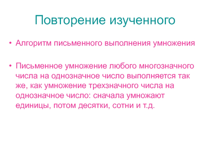 Повторение изученного Алгоритм письменного выполнения умноженияПисьменное умножение любого многозначного числа на однозначное число выполняется так же, как