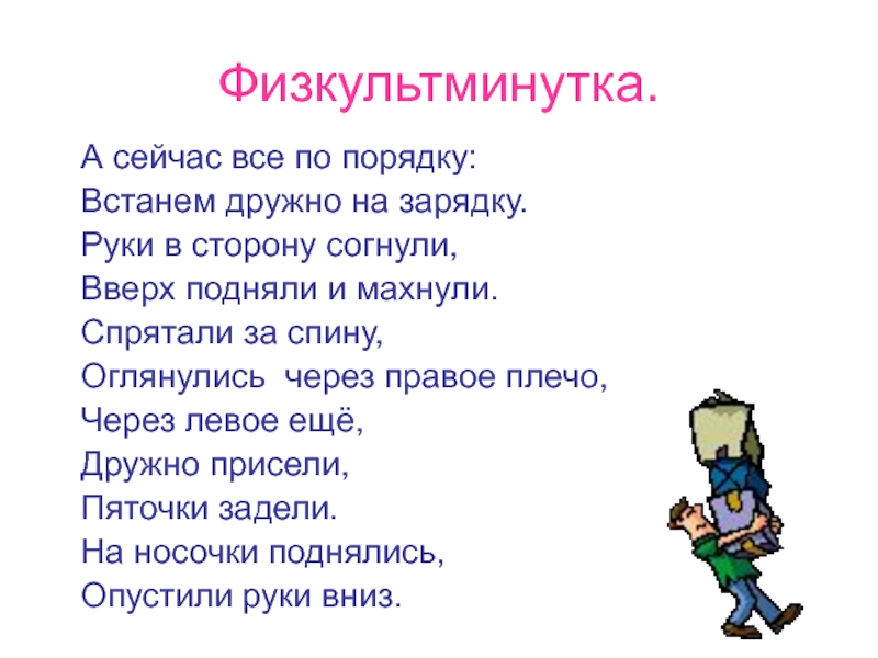 Физкультминутка.  А сейчас все по порядку:  Встанем дружно на зарядку.  Руки в сторону согнули,