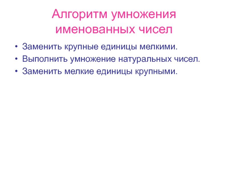 Алгоритм умножения именованных чисел Заменить крупные единицы мелкими. Выполнить умножение натуральных чисел.Заменить мелкие единицы крупными.