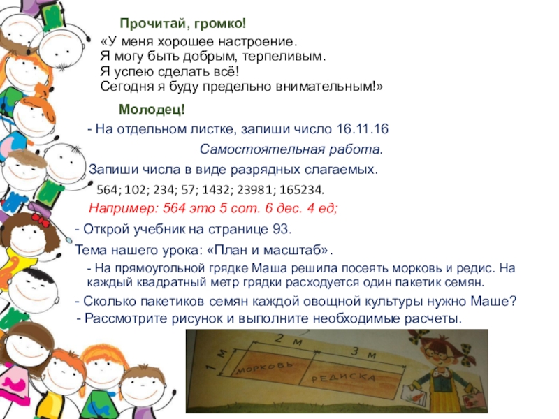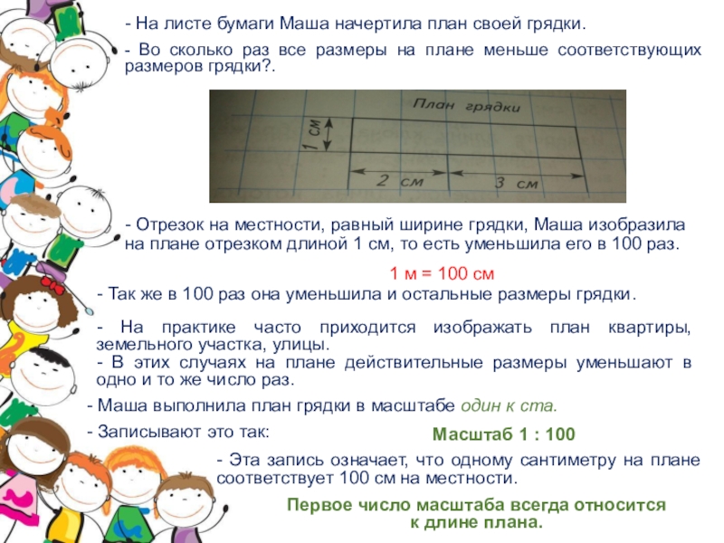 - Отрезок на местности, равный ширине грядки, Маша изобразила на плане отрезком длиной 1 см, то есть уменьшила его в 100 раз.