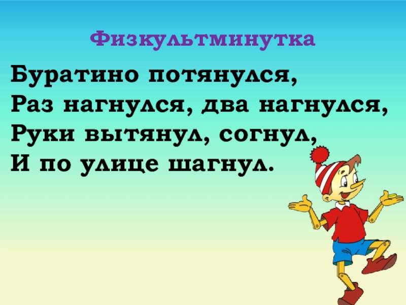 Физкультминутка Буратино потянулся, Раз нагнулся, два нагнулся, Руки вытянул, согнул,И по улице шагнул.