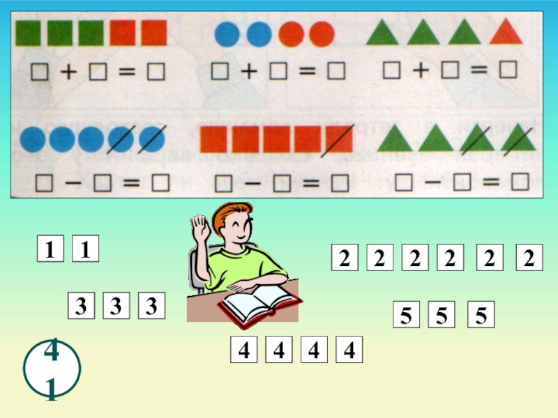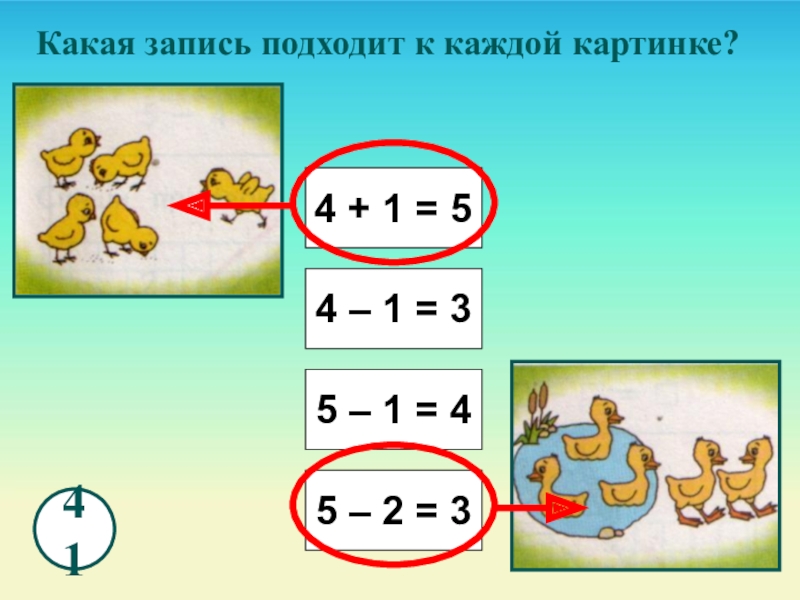 41Какая запись подходит к каждой картинке?4 + 1 = 54 – 1 = 35 – 1 =
