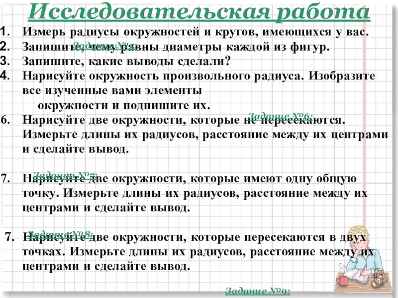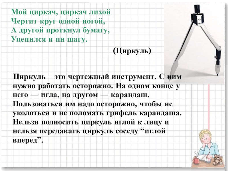 Циркуль – это чертежный инструмент. С ним нужно работать осторожно. На одном конце у него — игла, на другом — карандаш. Пользоваться им надо осторожно, чтобы не уколоться и не поломать грифель карандаша. Нельзя подносить циркуль иглой к лицу и нельзя передавать циркуль соседу “иглой вперед”.