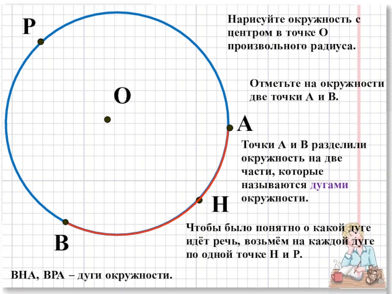 Чтобы было понятно о какой дуге идёт речь, возьмём на каждой дуге по одной точке Н и Р.