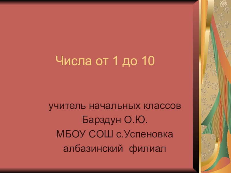 Числа от 1 до 10учитель начальных классовБарздун О.Ю.МБОУ СОШ с.Успеновкаалбазинский филиал