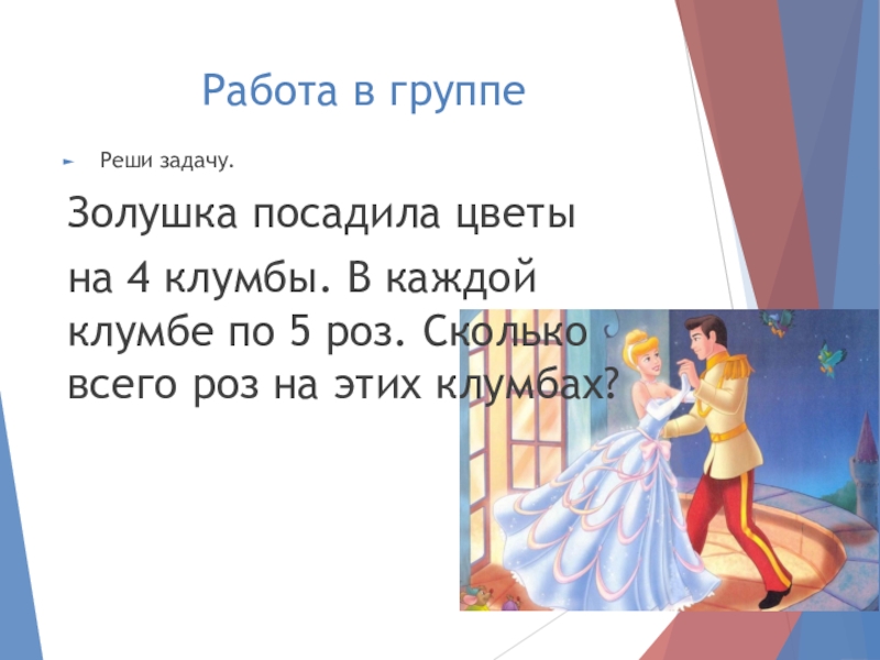 Работа в группе Реши задачу.Золушка посадила цветы на 4 клумбы. В каждой клумбе по 5 роз. Сколько