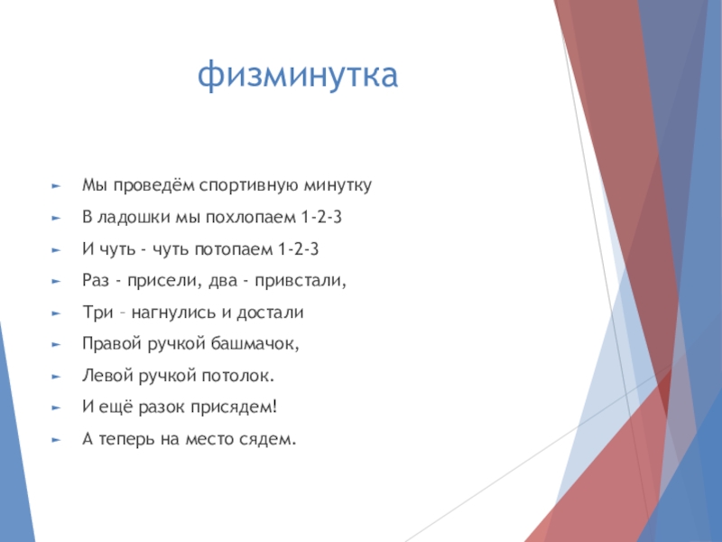 физминуткаМы проведём спортивную минуткуВ ладошки мы похлопаем 1-2-3И чуть - чуть потопаем 1-2-3Раз - присели, два -
