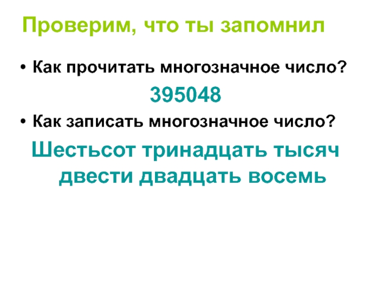 Проверим, что ты запомнилКак прочитать многозначное число?395048Как записать многозначное число?Шестьсот тринадцать тысяч двести двадцать восемь