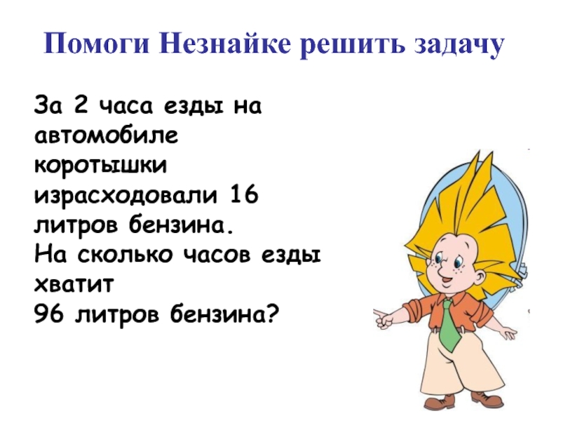 Помоги Незнайке решить задачуЗа 2 часа езды на автомобиле коротышки израсходовали 16 литров бензина.На сколько часов езды