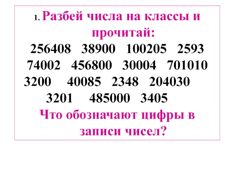 1. Разбей числа на классы и прочитай:256408  38900  100205  2593 74002  456800