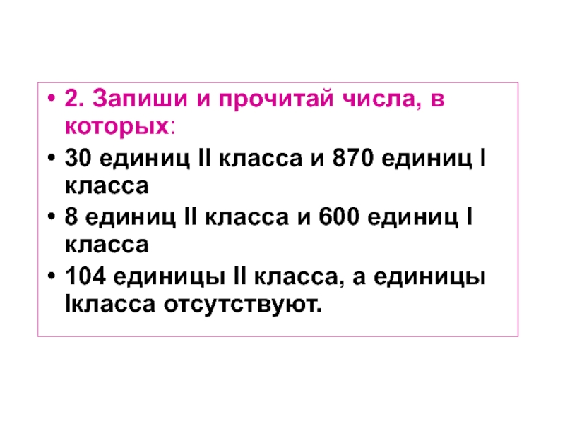 2. Запиши и прочитай числа, в которых:30 единиц II класса и 870 единиц I класса8 единиц II