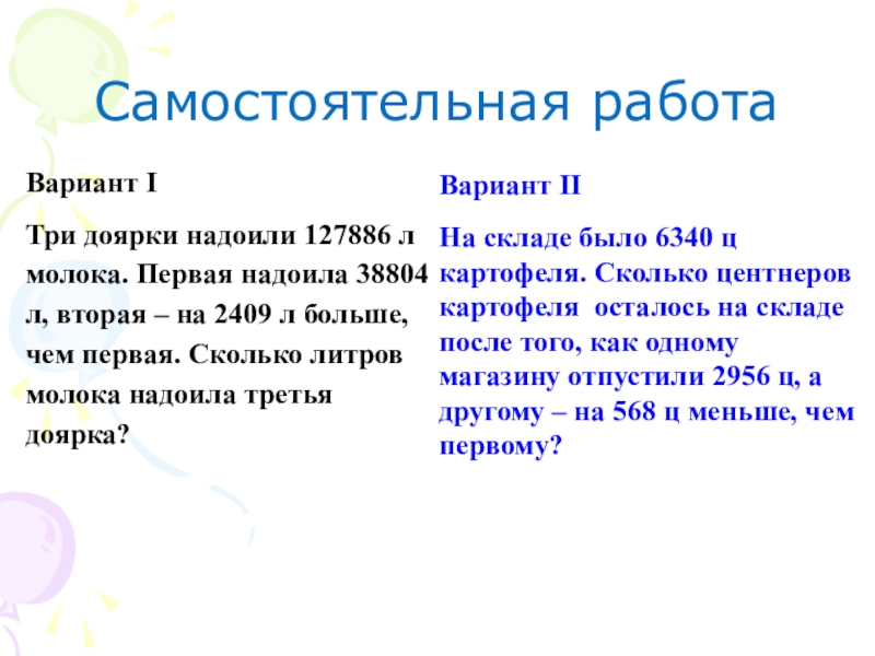 На складе было 6340 ц картофеля. Сколько центнеров картофеля осталось на складе после того, как одному магазину отпустили 2956 ц, а другому – на 568 ц меньше, чем первому?