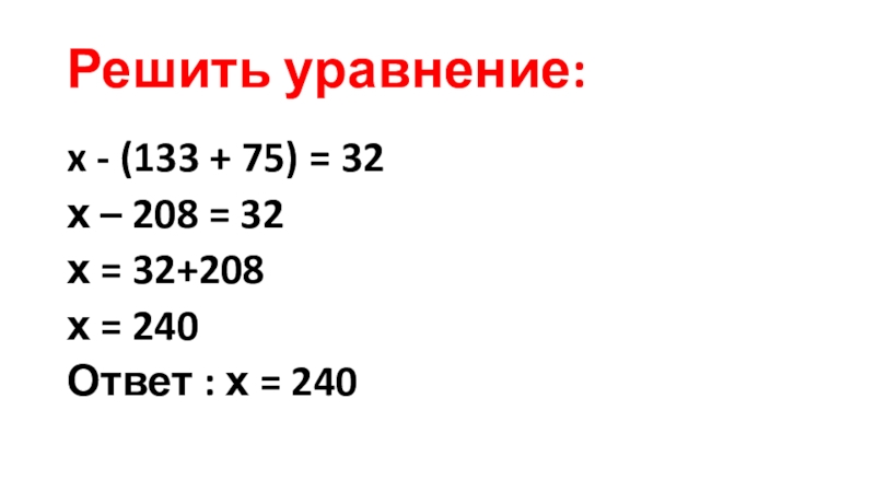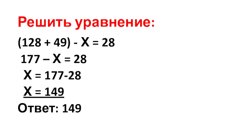 Решить уравнение:(128 + 49) - Х = 28 177 – Х = 28 Х = 177-28 Х