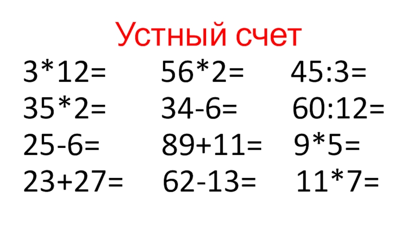 Устный счет3*12= 56*2= 45:3=35*2= 34-6= 60:12=25-6= 89+11= 9*5=23+27= 62-13= 11*7=