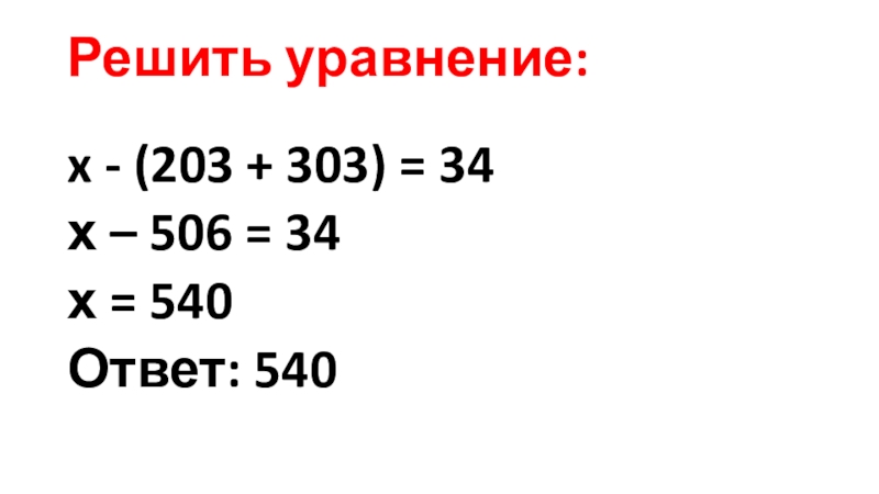 Решить уравнение:x - (203 + 303) = 34х – 506 = 34х = 540Ответ: 540