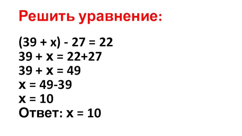 Решить уравнение:(39 + x) - 27 = 2239 + х = 22+2739 + х = 49х =