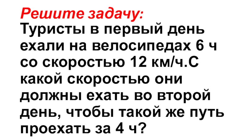 Решите задачу:Туристы в первый день ехали на велосипедах 6 ч со скоростью 12 км/ч.С какой скоростью они