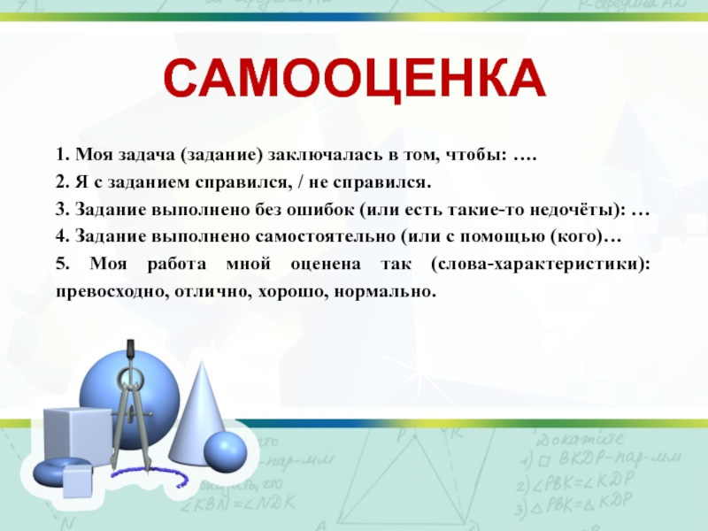 САМООЦЕНКА1. Моя задача (задание) заключалась в том, чтобы: …. 2. Я с заданием справился, / не справился.