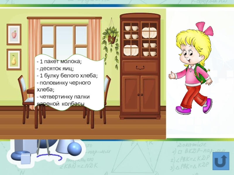- 1 пакет молока;- десяток яиц;- 1 булку белого хлеба;- половинку черного хлеба;- четвертинку палки вареной колбасы