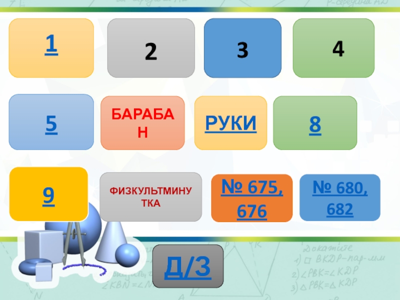 12345БАРАБАНРУКИ8ФИЗКУЛЬТМИНУТКА9№ 675, 676№ 680, 682Д/З