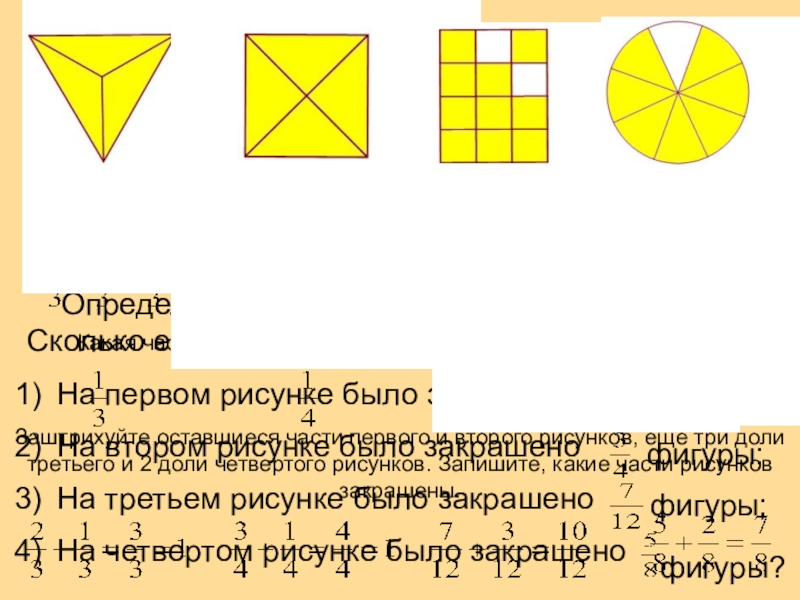 Заштрихуйте оставшиеся части первого и второго рисунков, ещё три доли третьего и 2 доли четвертого рисунков. Запишите, какие части рисунков закрашены.