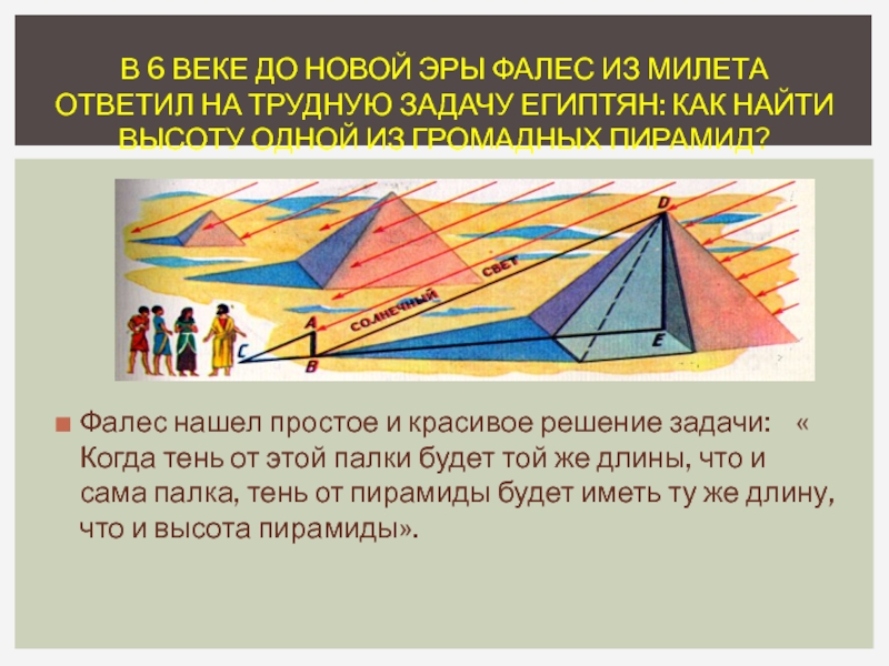 Фалес нашел простое и красивое решение задачи: « Когда тень от этой палки будет той же длины, что и сама палка, тень от пирамиды будет иметь ту же длину, что и высота пирамиды».