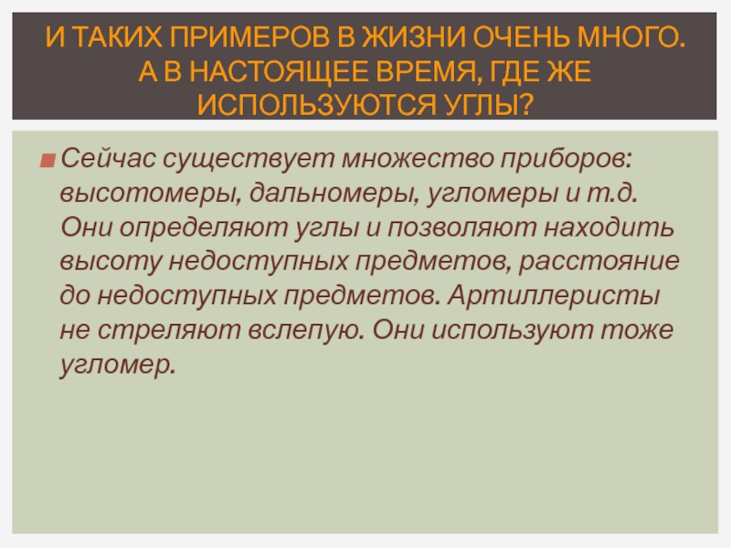 Сейчас существует множество приборов: высотомеры, дальномеры, угломеры и т.д. Они определяют углы и позволяют находить высоту недоступных предметов, расстояние до недоступных предметов. Артиллеристы не стреляют вслепую. Они используют тоже угломер.