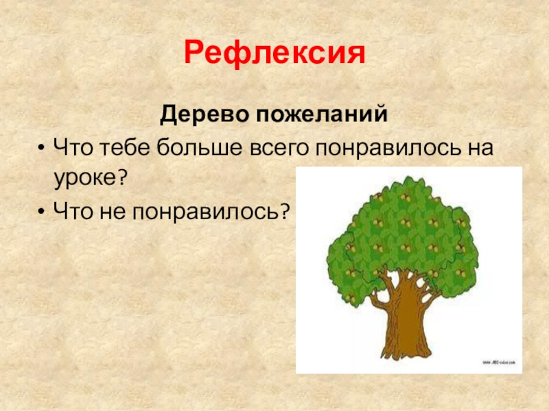 РефлексияДерево пожеланийЧто тебе больше всего понравилось на уроке?Что не понравилось?