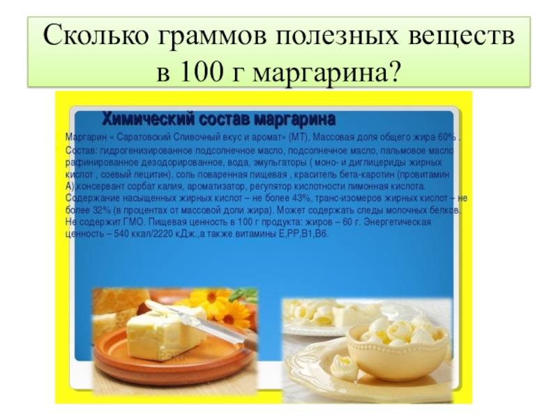 Слайд 9Сколько граммов полезных веществ в 100 г маргарина?