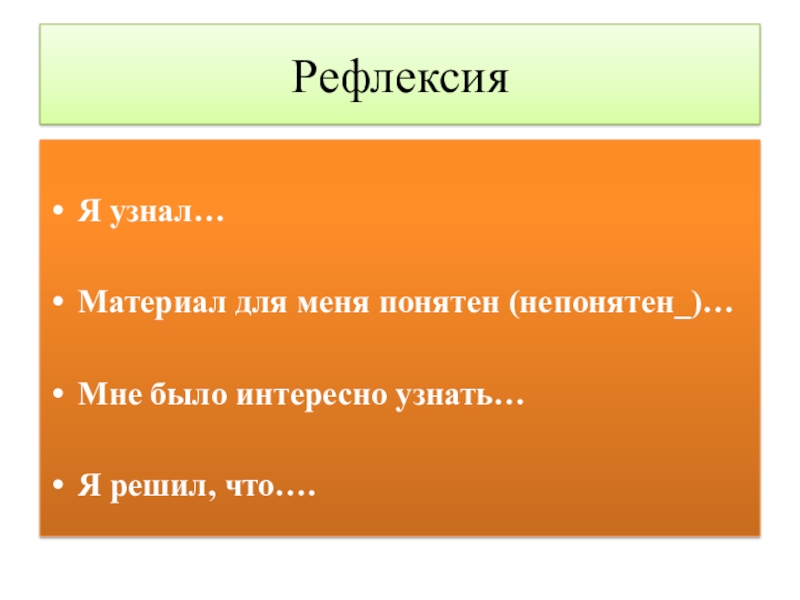 РефлексияЯ узнал…Материал для меня понятен (непонятен_)…Мне было интересно узнать…Я решил, что….