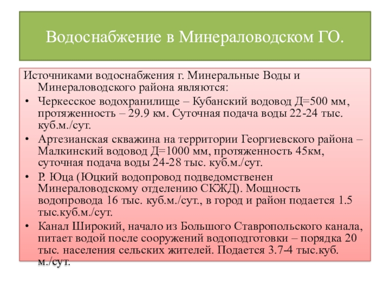 Водоснабжение в Минераловодском ГО.Источниками водоснабжения г. Минеральные Воды и Минераловодского района являются: Черкесское водохранилище – Кубанский водовод