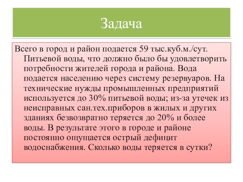 должно было бы удовлетворить потребности жителей города и района. Вода подается населению через систему резервуаров. На технические нужды промышленных предприятий используется до 30% питьевой воды; из-за утечек из неисправных сан.тех.приборов в жилых и других зданиях безвозвратно теряется до 20% и более воды. В результате этого в городе и районе постоянно ощущается острый дефицит водоснабжения. Сколько воды теряется в сутки?