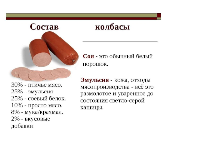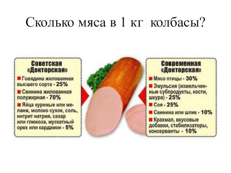 Слайд 7Сколько мяса в 1 кг колбасы?