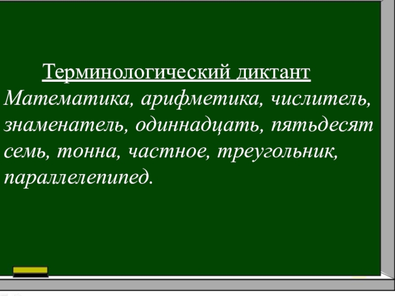 Терминологический диктантМатематика, арифметика, числитель, знаменатель, одиннадцать, пятьдесят семь, тонна, частное, треугольник, параллелепипед.