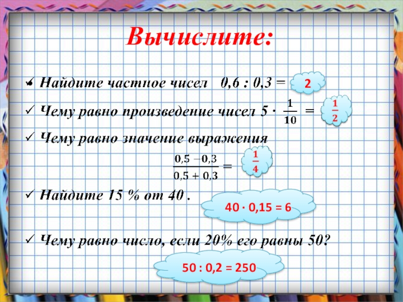 Вычислите:2  40 ∙ 0,15 = 650 : 0,2 = 250