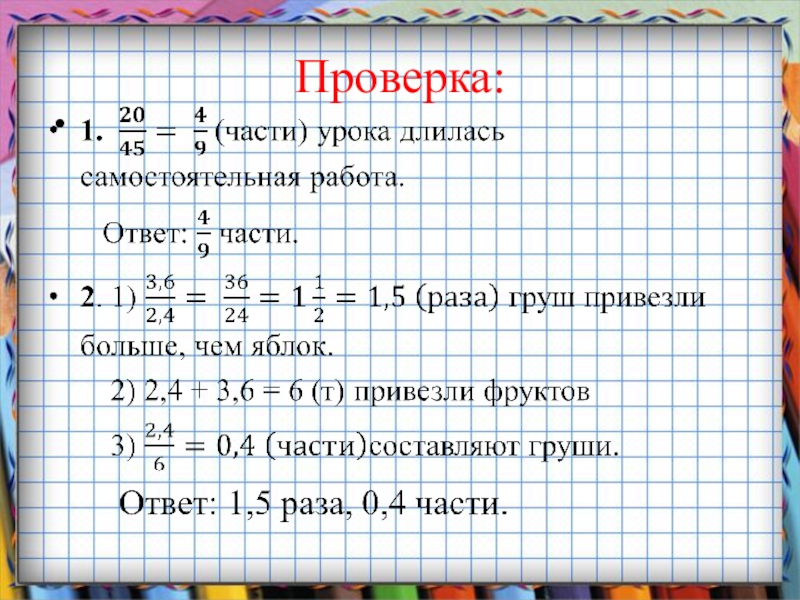 2. В магазин привезли 2,4 т груш и 3,6 т яблок. Во сколько раз больше привезли яблок, чем груш? Какую часть привезенных фруктов составляют груши?