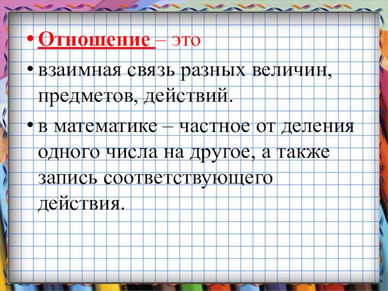 Отношение – этовзаимная связь разных величин, предметов, действий.в математике – частное от деления одного числа на