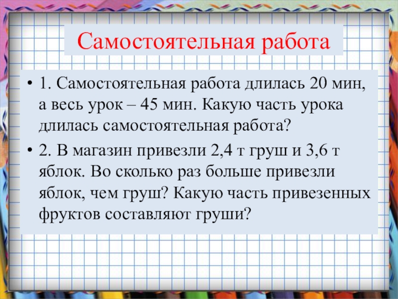 Самостоятельная работа1. Самостоятельная работа длилась 20 мин, а весь урок – 45 мин. Какую часть урока длилась