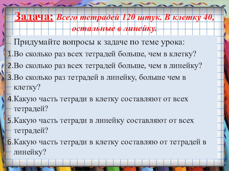 Задача: Всего тетрадей 120 штук. В клетку 40, остальные в линейку.  Придумайте вопросы к задаче по