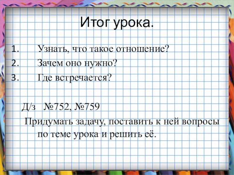 Итог урока.Узнать, что такое отношение?Зачем оно нужно?Где встречается?   Д/з  №752, №759  Придумать задачу,