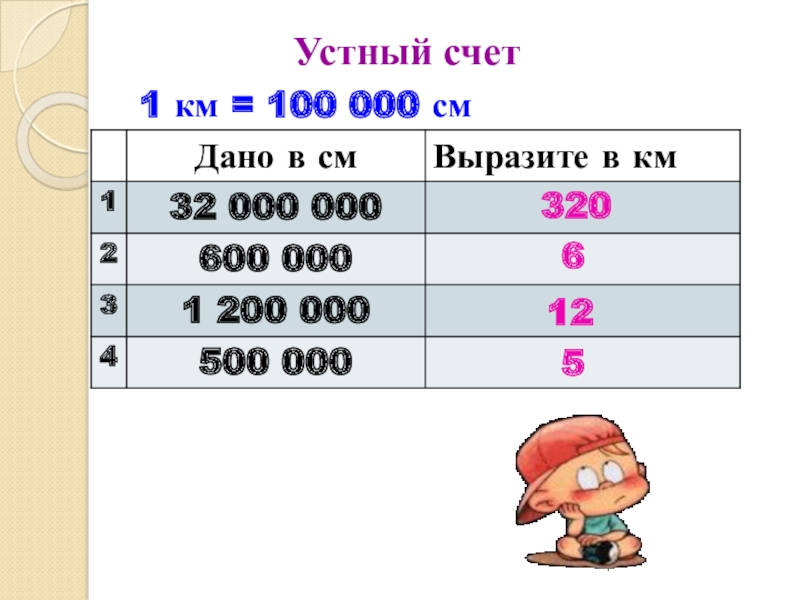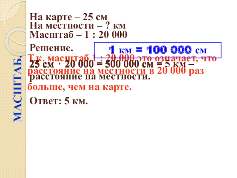 25 см 20 000 = 500 000 см = 5 км – расстояние на местности.